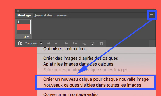 Allez dans le menu contextuel du panneau et désactivez l'option "Créer un nouveau calque pour chaque image" ainsi que l'option "Nouveaux calques visibles dans toutes les images" (on ne veut pas que ces options soient cochées).