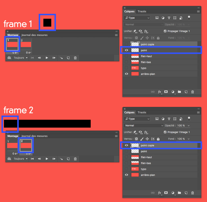 Assurez-vous que dans le frame 3 seul le calque "point copie copie" soit allumé avec l'arrière-plan.