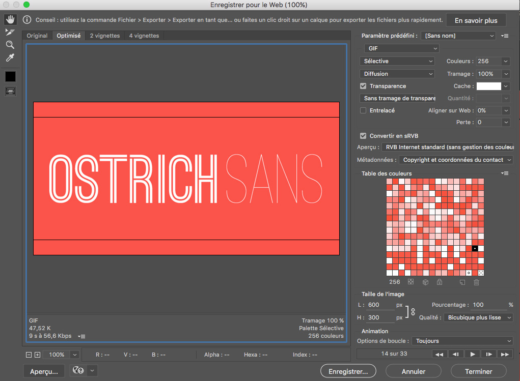 La meilleure façon de vérifier votre animation sur le plan de la vitesse est de la glisser directement dans la fenêtre de votre fureteur : Chrome, Firefox, Safari, etc. Vous constaterez que la vitesse est différente dans un browser que dans Photoshop.