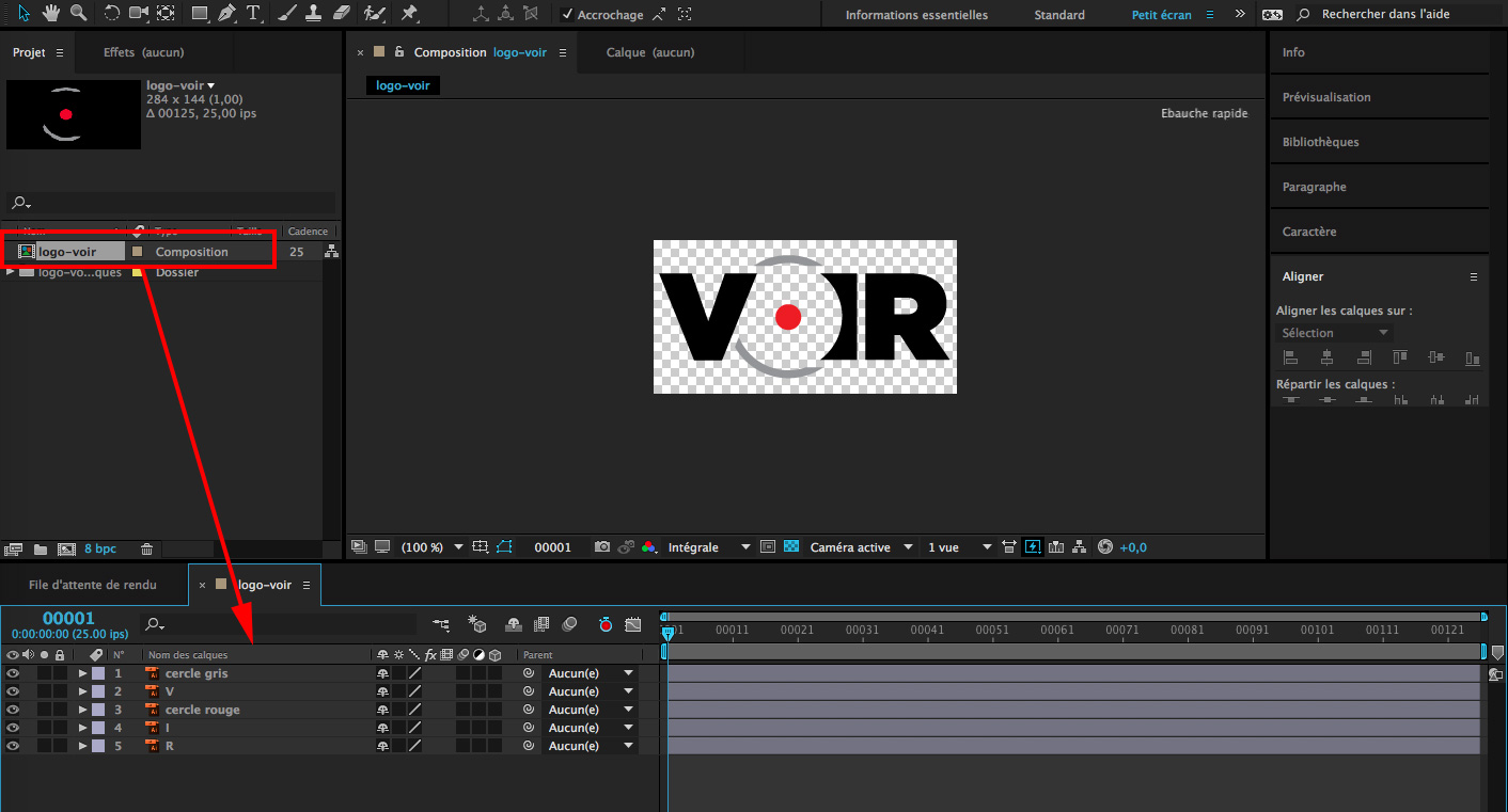Double cliquez sur le fichier Illustrator pour que la composition apparaisse dans la fenêtre de montage