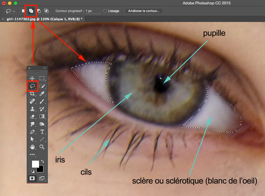 Avec le lasso, sélectionnez le blanc d'un des yeux. Pour pouvoir sélectionner les différentes portions de l'oeil, assurez-vous de cocher l'option « ajouter à la sélection ». Autre manière d'ajouter à la sélection : enfoncez la touche MAJ.