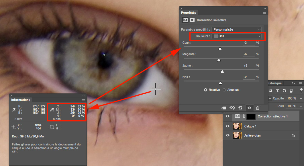 Ouvrez ensuite le panneau Fenêtre > Informations. Lorsque que vous survolez le blanc de l'oeil avec votre curseur, vous pouvez voir les valeurs des CYANS, MAGENTAS, JAUNES et NOIRS présentes à l'endroit où vous passer la souris. L'idée, est de ramener les valeurs de ces différentes couleurs à un niveau plus ou moins similaire.