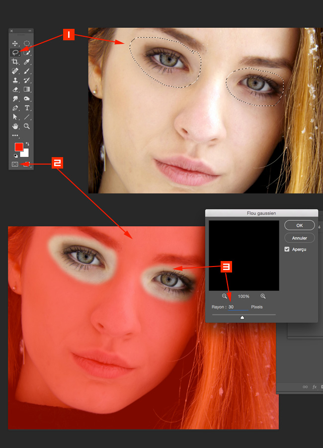 Une fois les réglages terminés, effectuez le même processus de sélection avec le mode masque, le flou gaussien et les dégradés pour l'autre oeil. Remplissez pour finir le masque de la correction sélective avec du blanc et l'effet s'appliquera également à l'autre oeil.