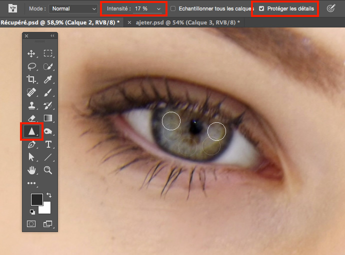 À cette étape, nous allons augmentez la lumière et les ombres des petits détails de l'iris avec la technique Dodge & Burn.