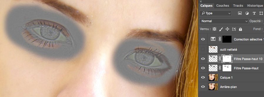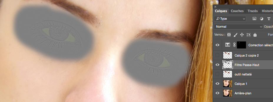 Sur une autre copie du calque des yeux (fermez les 2 autres calques des yeux), appliquez le Filtre > Divers > Passe-haut (1,5 pixels de rayon pour une image de 36 mégapixels) et changez l'opacité du calque pour Lumière vive.