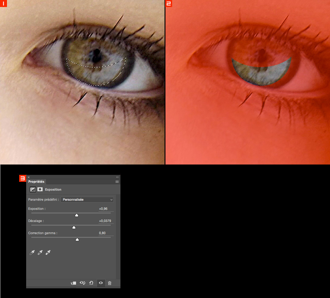 Nous allons profiter du calque de réglage EXPOSITION précédent avec son masque pour rehausser la lumière se réfléchissant sur la paupière inférieure. Avec un pinceau blanc d'une opacité faible (10-20%) peignez une ligne blanche sur la paupière inférieure à peu près comme dans l'image ci-dessous :