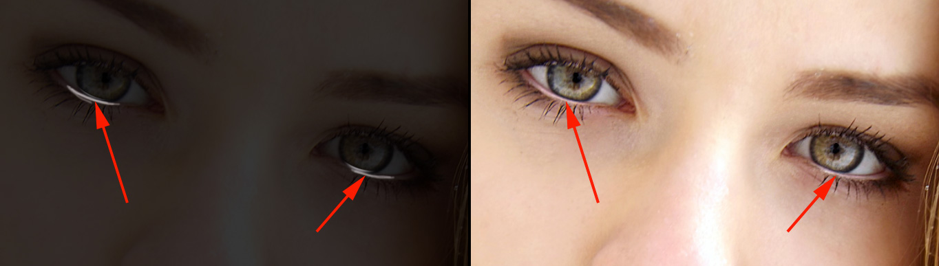 2) Il ne faut pas oublier que les paupières inférieures et supérieures ont une épaisseur. Souvent on voit un petit liseré clair en bas de l’iris, ce n’est autre que l’épaisseur de la paupière inférieure qui renvoie la lumière.